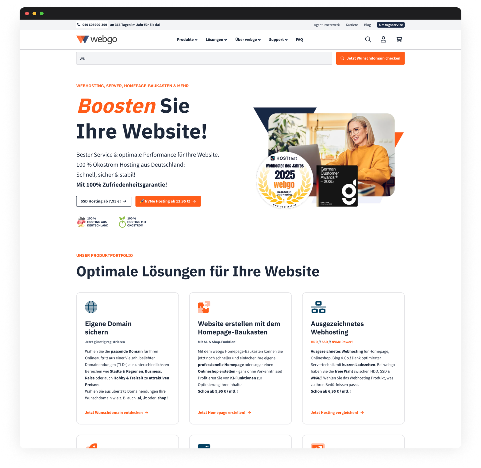 Für unseren Kunden webgo, einen deutschen Webhoster, haben wir eine neue, hochskalierbare Plattform auf Basis des Flat-File-CMS Statamic entwickelt. Statamic ermöglicht uns eine performante, flexible Content-Struktur ohne klassische Datenbankabhängigkeit und bietet Redakteur:innen ein sehr intuitives Editing-Erlebnis. Auf Basis detaillierter UX-Wireframes entstand ein klares, nutzerzentriertes User Interface Design, das konsequent in ein modernes Frontend und ein modular aufgebautes Backend überführt wurde. Über individuelle SSO-Anbindungen ist die Plattform tief mit dem webgo-Kundenportal und der Checkout-Strecke verknüpft, sodass Nutzer:innen nahtlos zwischen den Systemen wechseln können.